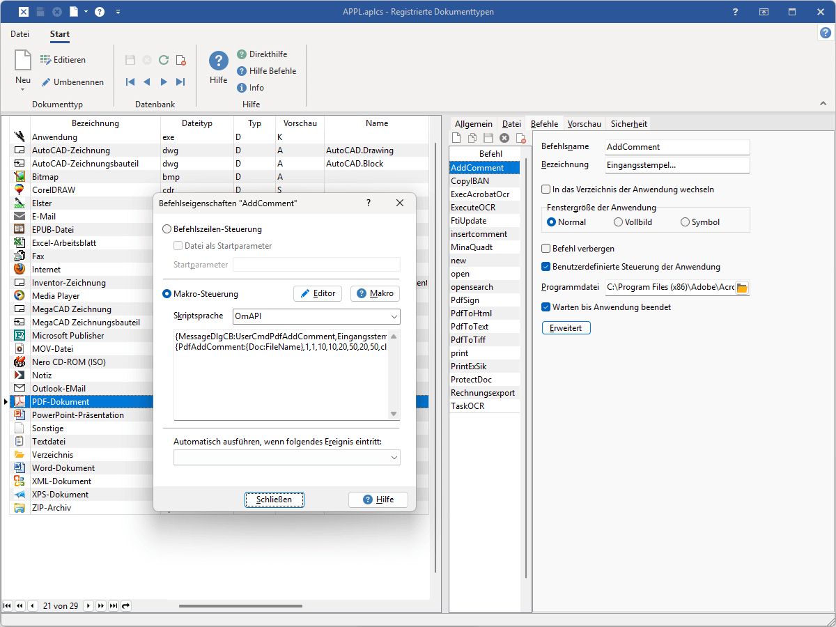 Hier wird beschrieben, wie Sie den einzelnen Dokumenttypen für PDF, MS Word u. a. neue Funktionen hinzufügen können. Diese benutzerdefinierten Befehle sind nur sichtbar bzw. verfügbar, wenn ein Dokument des entsprechenden Typs der Archivtabelle markiert ist. Alternativ können auch allgemeingültige Befehle hinzugefügt werden.