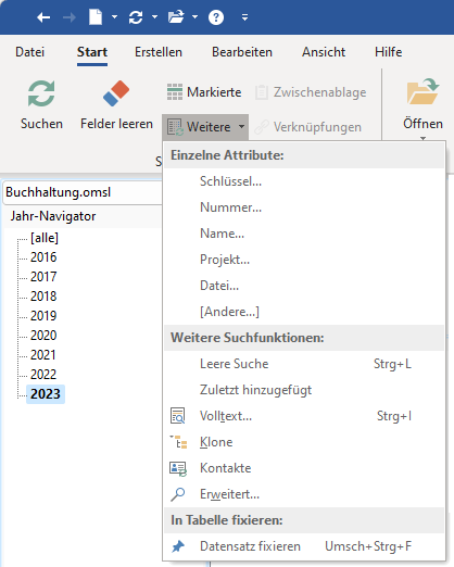 Klicken Sie bitte auf der Menüseite Start | Suchen auf Weitere. Hier finden Sie zusätzliche Möglichkeiten für die Archivsuche: