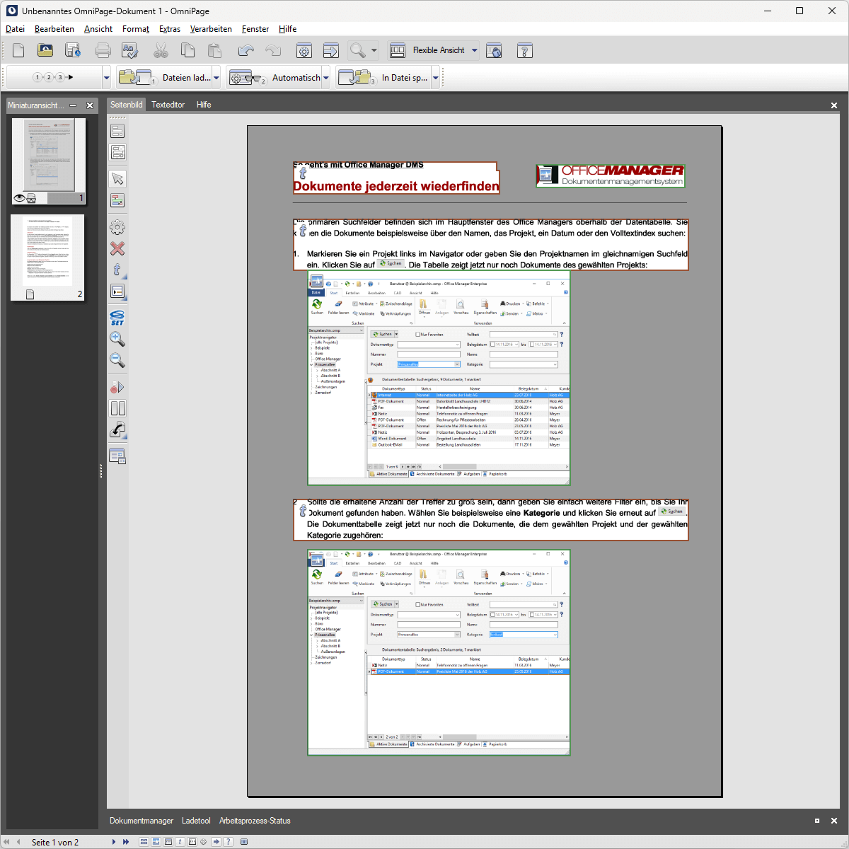 Die OCR-Texterkennungssoftware OmniPage von Tungsten (eh. Kofax und Nuance) kann verarbeitete Dokumente unter anderem als PDF/A-Dokument speichern. Im Folgenden wird beschrieben, wie Sie diese Funktion zusammen mit unserem Archivierungsprogramm "Office Manager" verwenden.